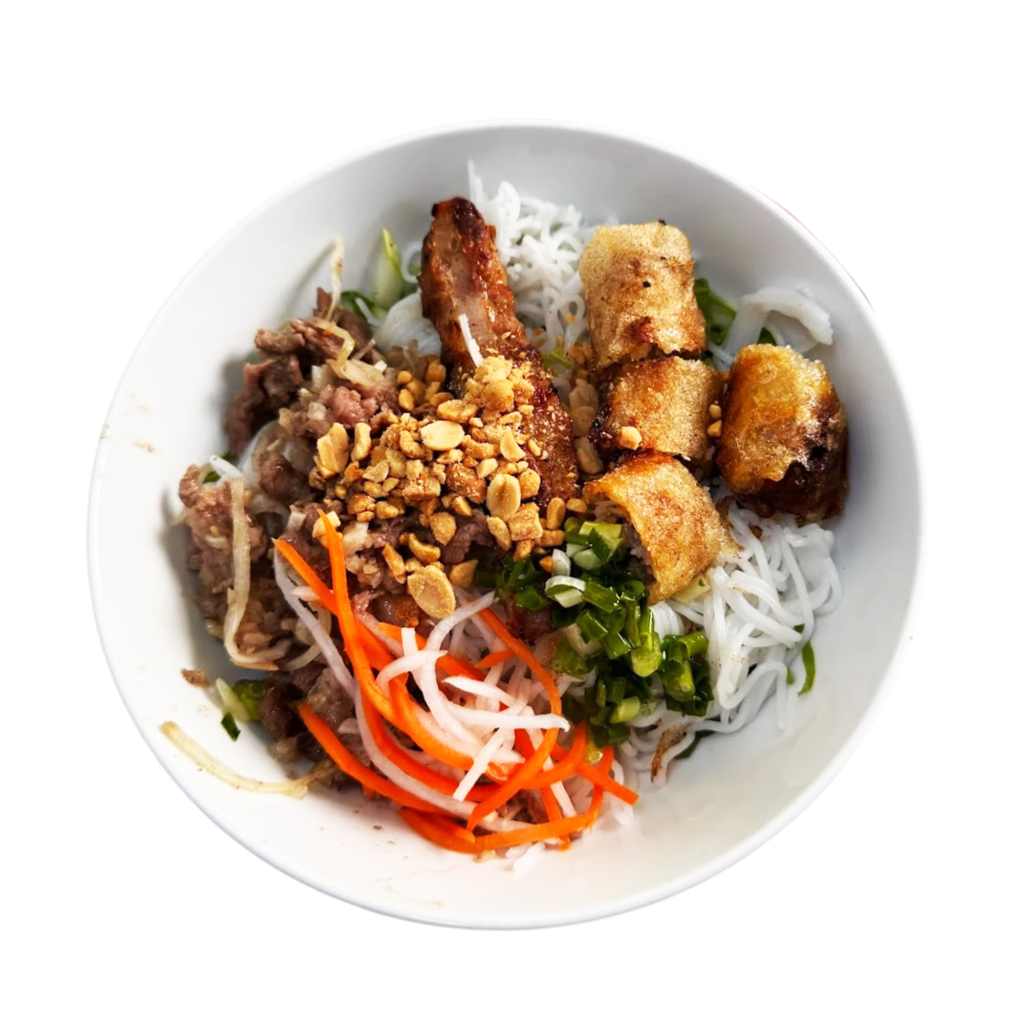 (Heo, Bò, Gà, Tôm & Chả Giò) Combination Noodle Bowl: Grilled Meats (Pork, Beef, Chicken, Shrimp & Egg Rolls)
